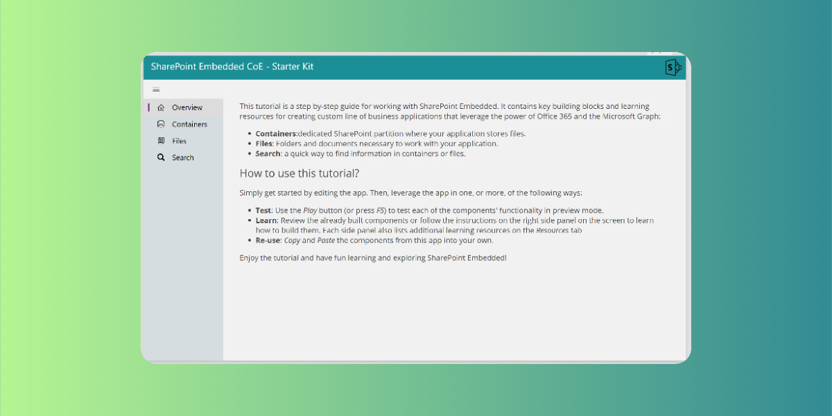 This starter kit provides a basic application for managing your containers, allowing you to analyze the code and use it as a reference for interacting with SharePoint Embedded Graph endpoints. Whether you're starting a new project or looking to learn more about SharePoint Embedded, this kit is a valuable resource.
