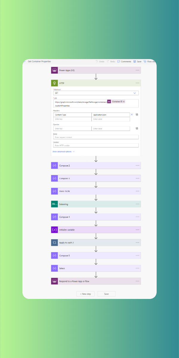 To handle the backend logic and interactions with SharePoint Embedded, it has been implemented 20 Power Automate flows. These flows utilize the Microsoft Graph API to execute actions related to container management, column management, property management, and file management. Each flow follows a straightforward structure, triggered by the Power Apps application and executing HTTP actions to interact with the Microsoft Graph API (Premium license required).