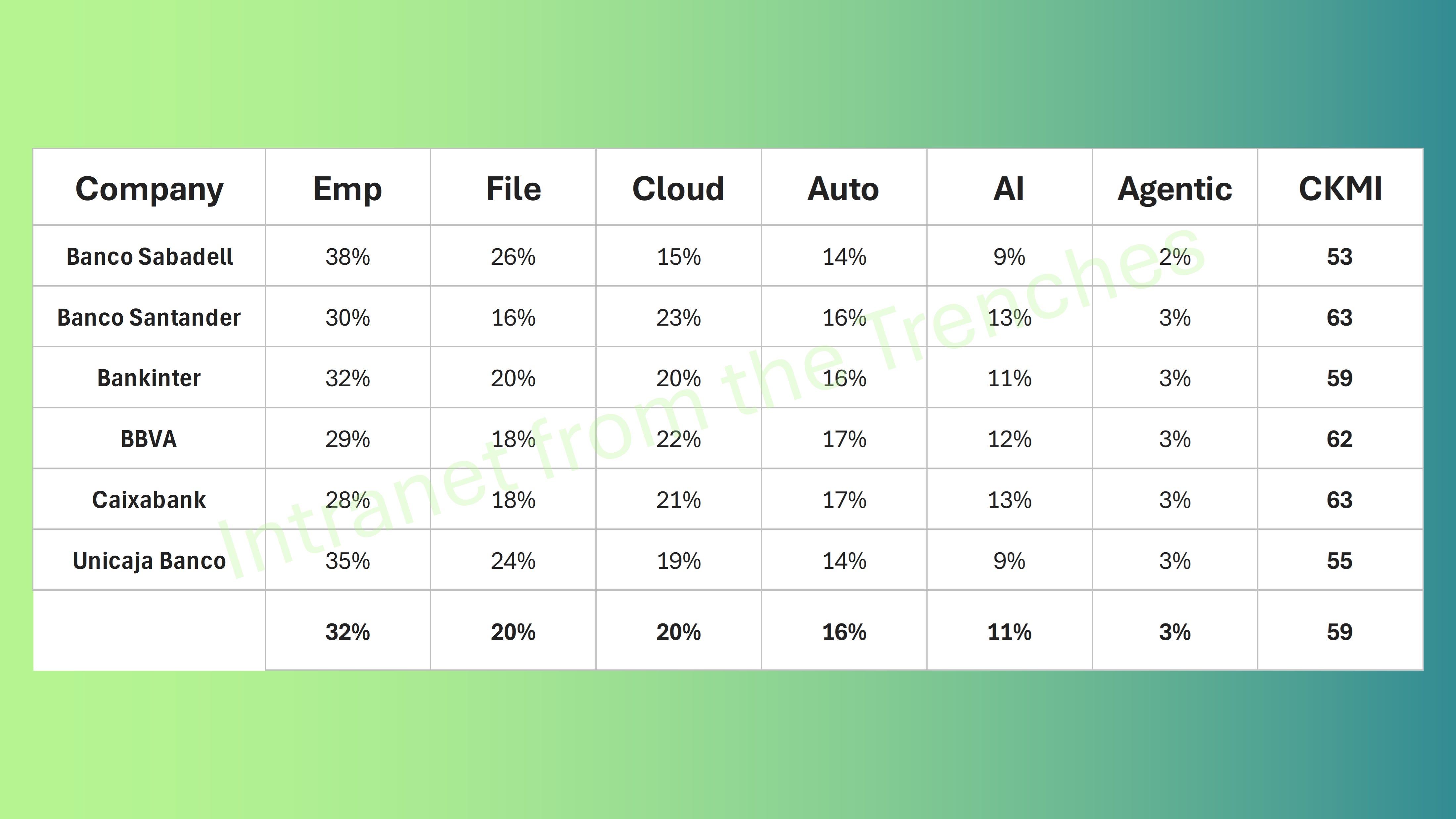 AI (9–13%) — This is where differentiation begins. Santander and Caixabank push ahead; Sabadell and Unicaja lag.