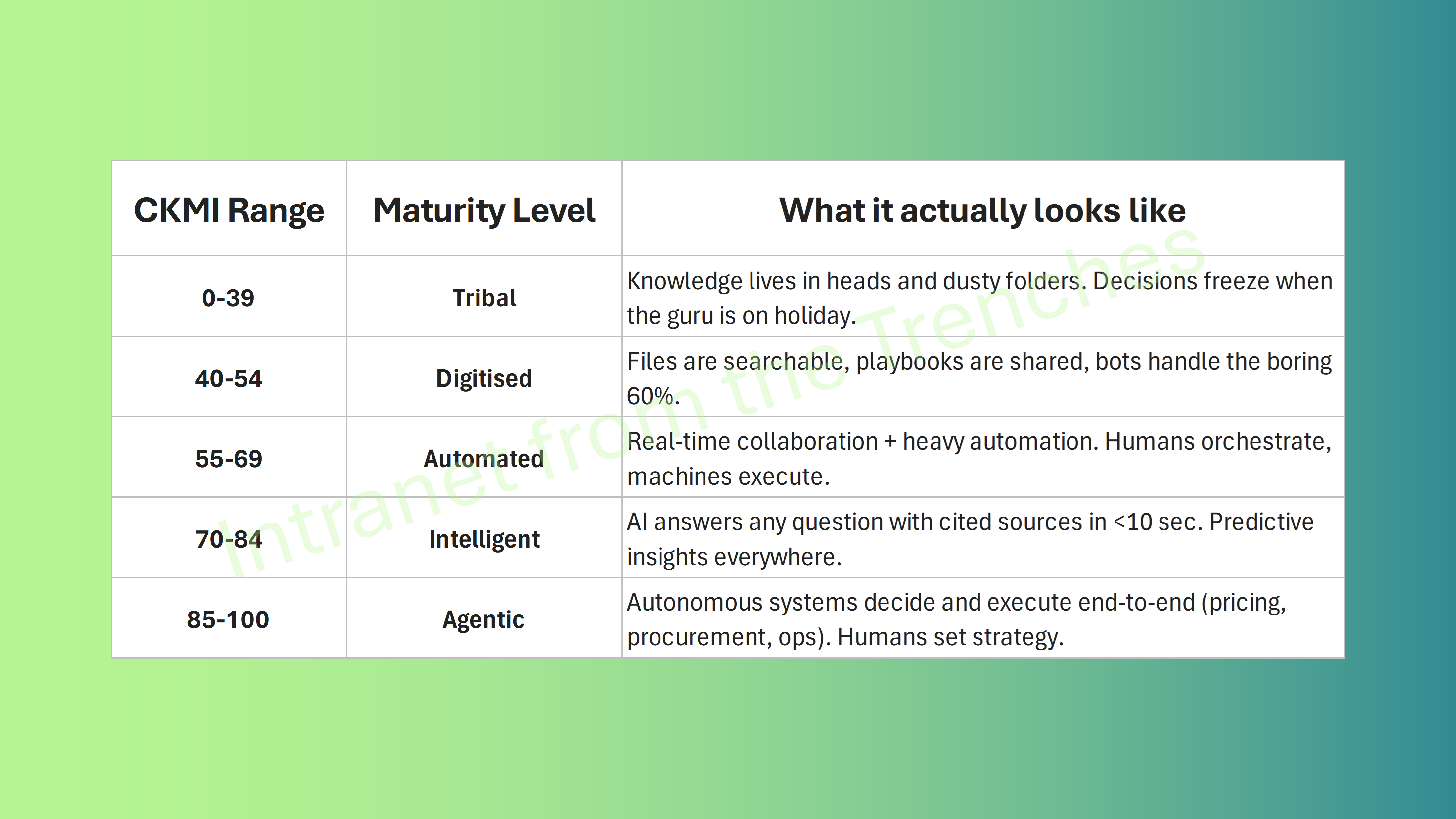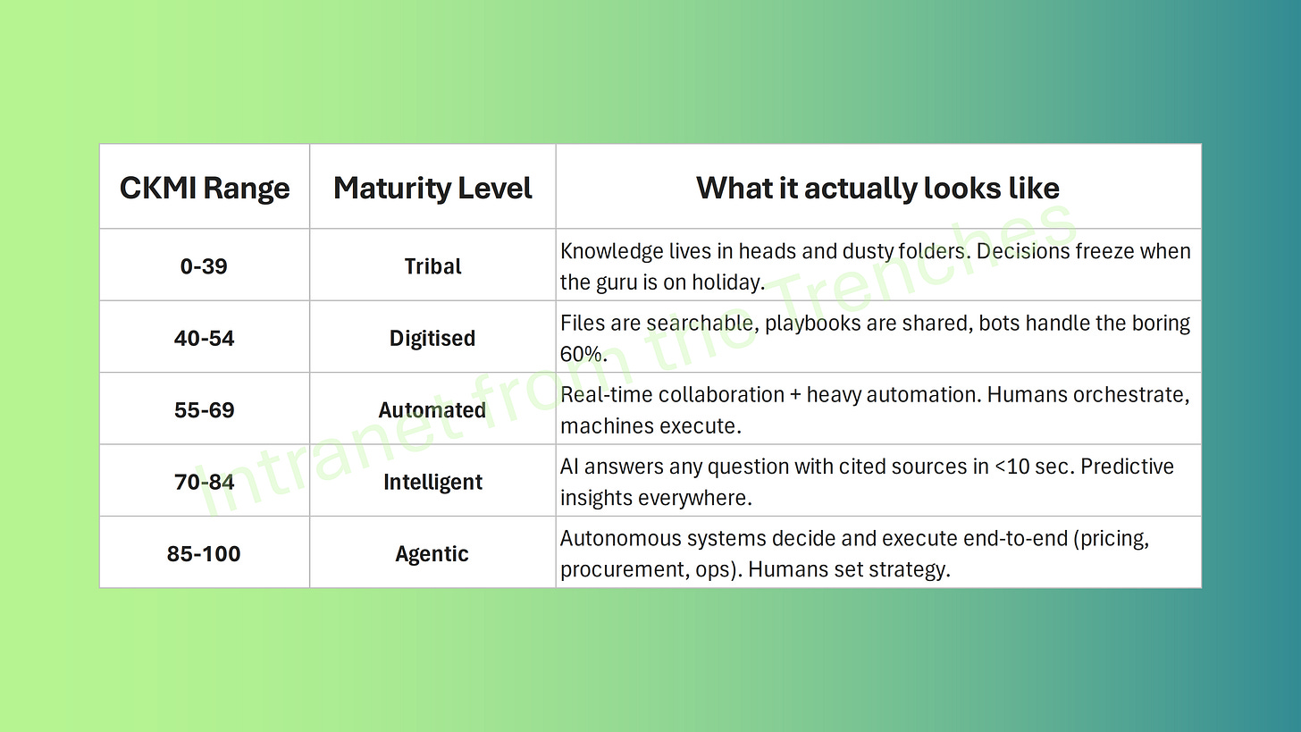 The six-bucket game and the CKMI model reveal a simple truth: maturity isn’t about how much knowledge your company holds—it’s about how little you rely on any single person to use it. Every 10-point shift to the right (from Employees toward Agentic) cuts decision latency, reduces key-person risk, and frees people to focus on strategy instead of searching for information.