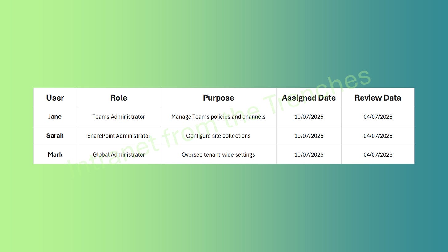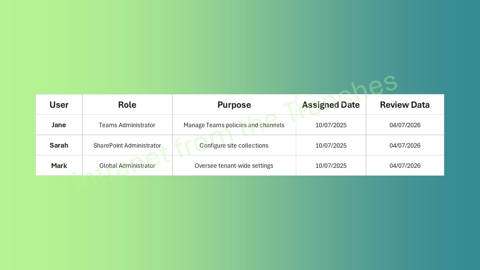 Plan for Regular Reviews: Set a reminder to review the role assignment, typically every 6 months, to ensure it’s still necessary. For example, schedule a review for April 2026 to check if Jane still needs the Teams Administrator role or if her responsibilities have changed, keeping your environment secure.