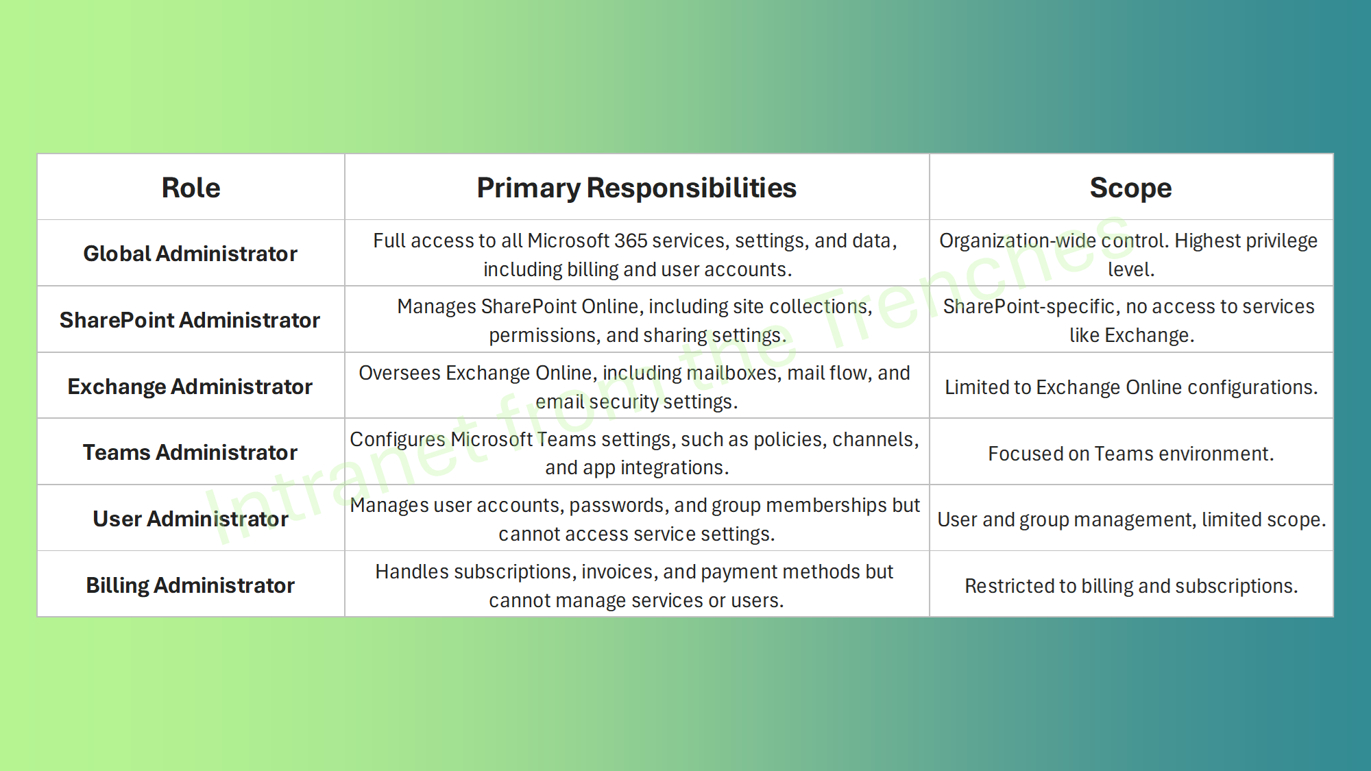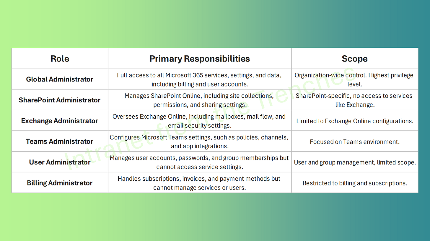 Microsoft 365 offers roles ranging from broad to task-specific permissions. Below are some key roles and their responsibilities:
